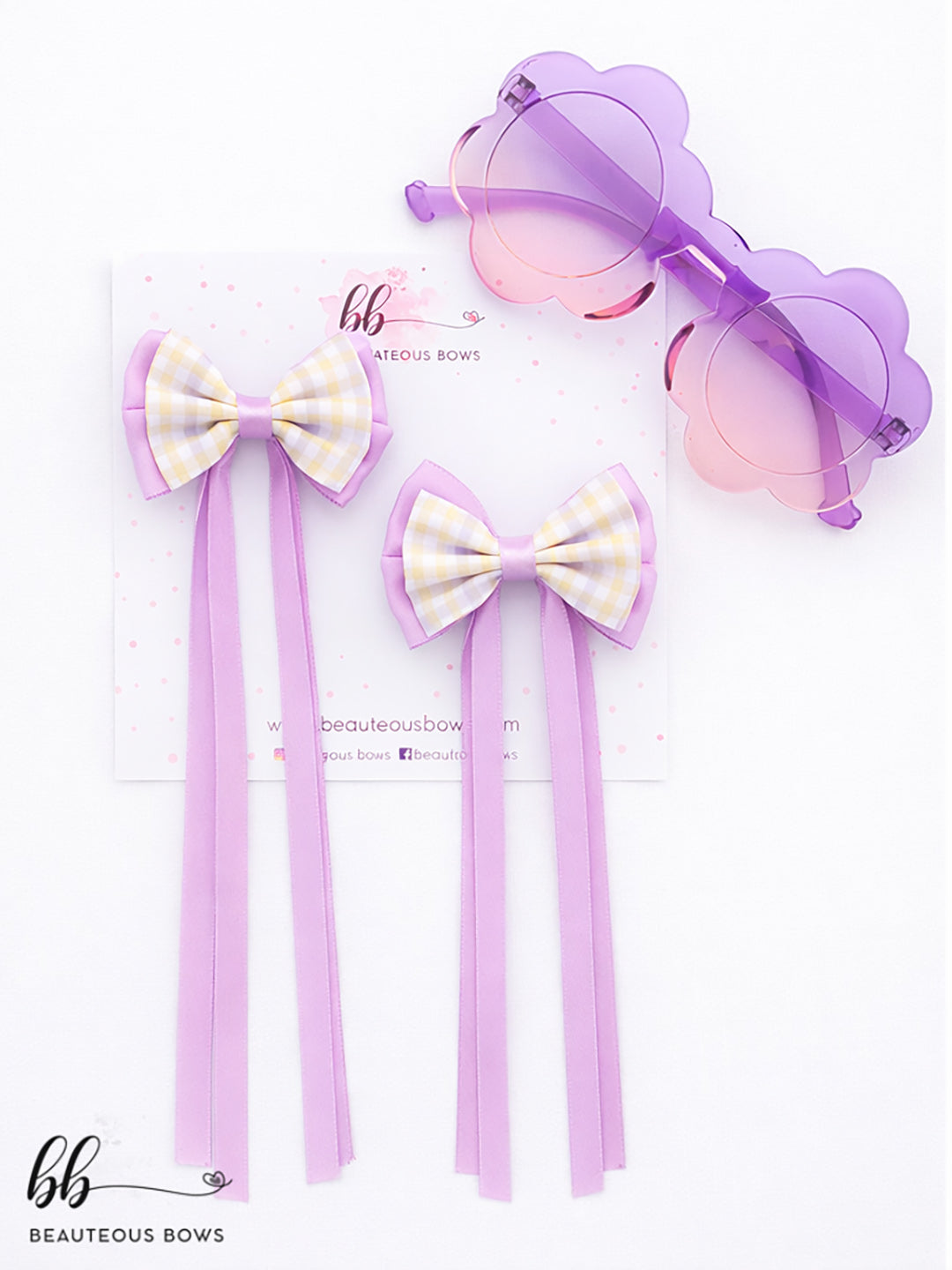 This playful combo features cloud-shaped sunglasses paired with tiny gingham bow hair clips accented by long satin ribbons for a whimsical touch.