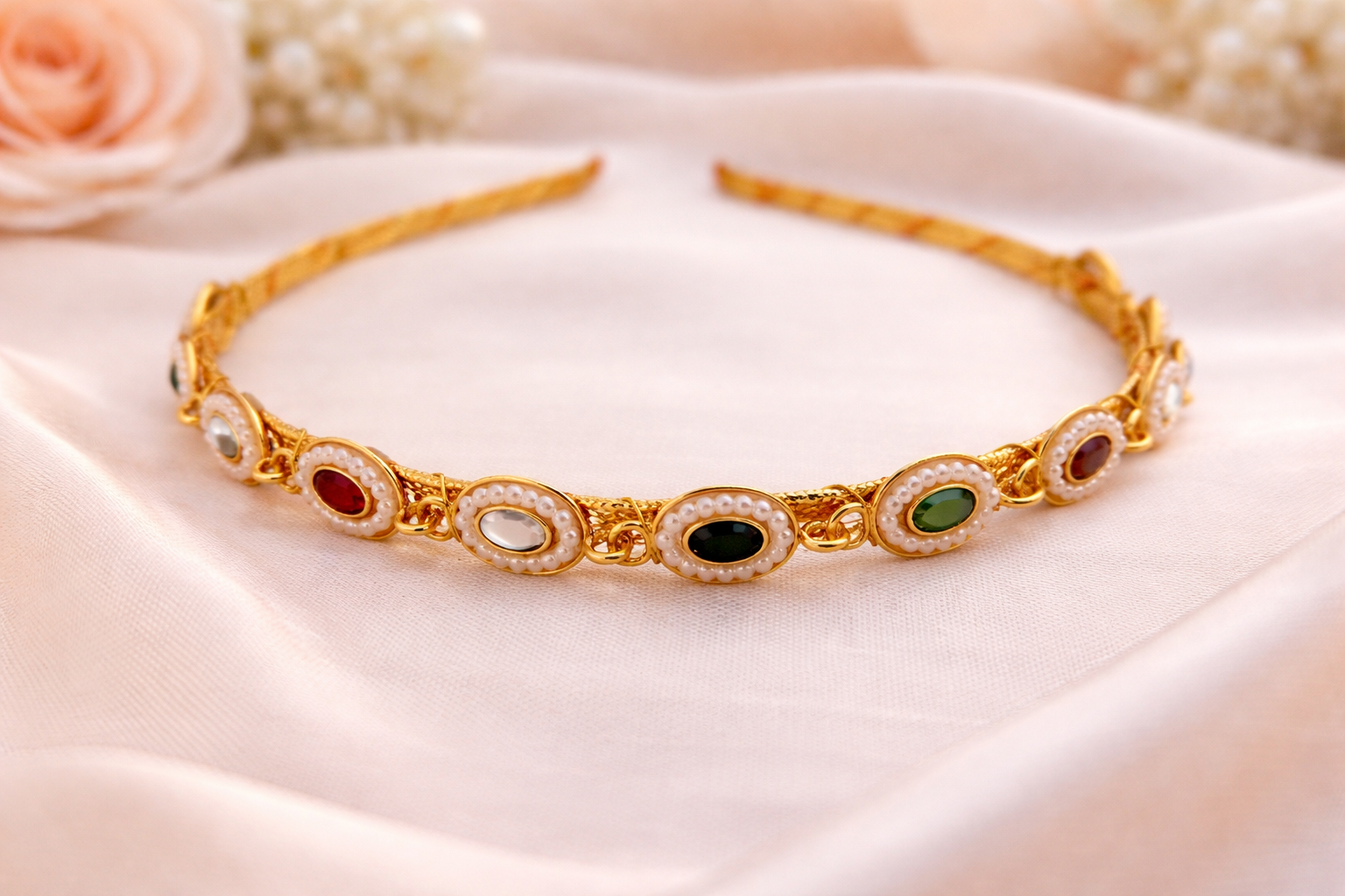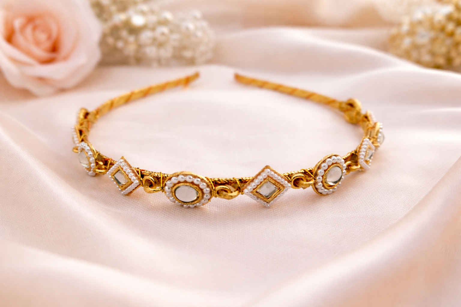 Gold hairband, beautifully detailed with Kundan stones and delicate pearl accents for a timeless finish.