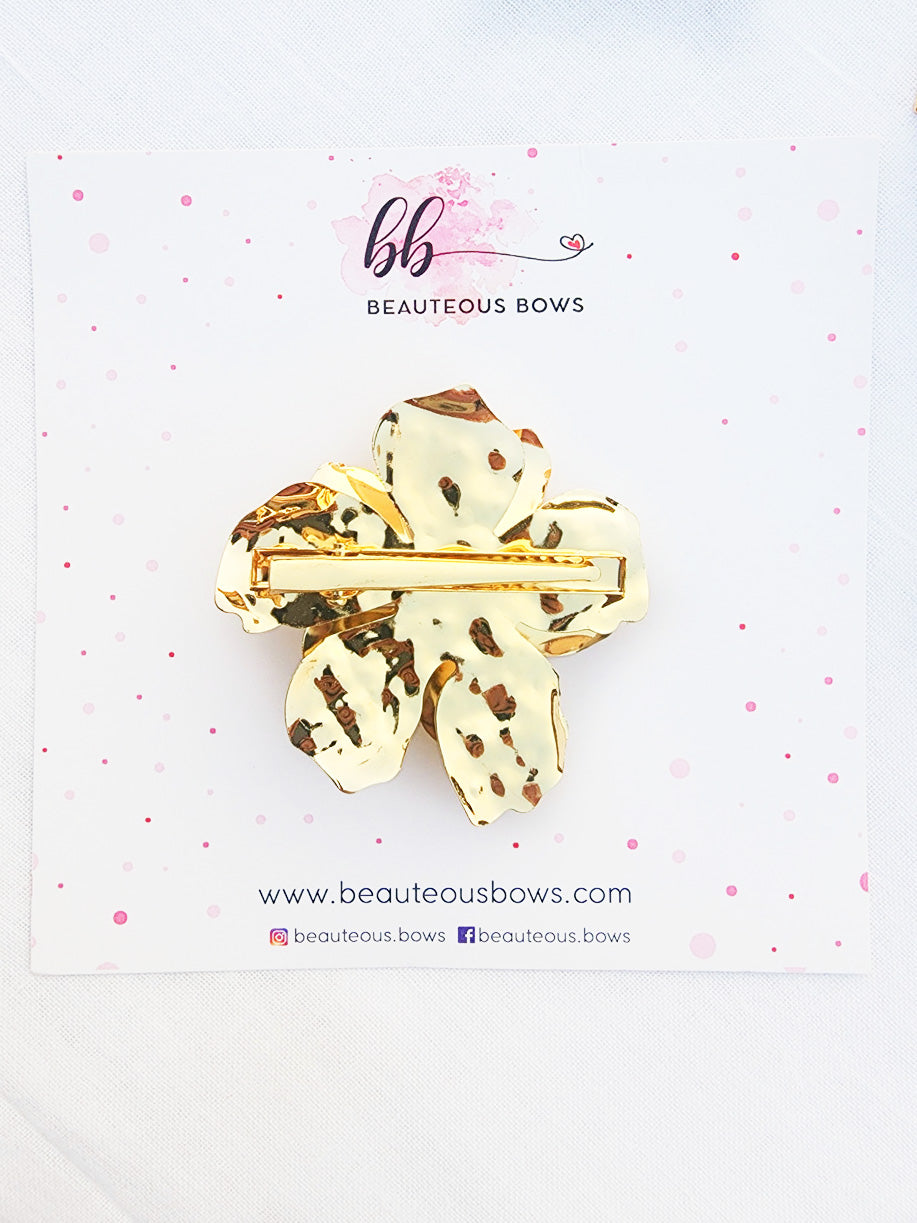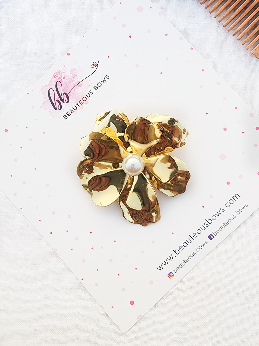 This Statement Gold Bloom hair clip features sculpted metallic petals with a hammered finish and a luminous faux pearl centre, creating an elegant, luxurious look in seconds.