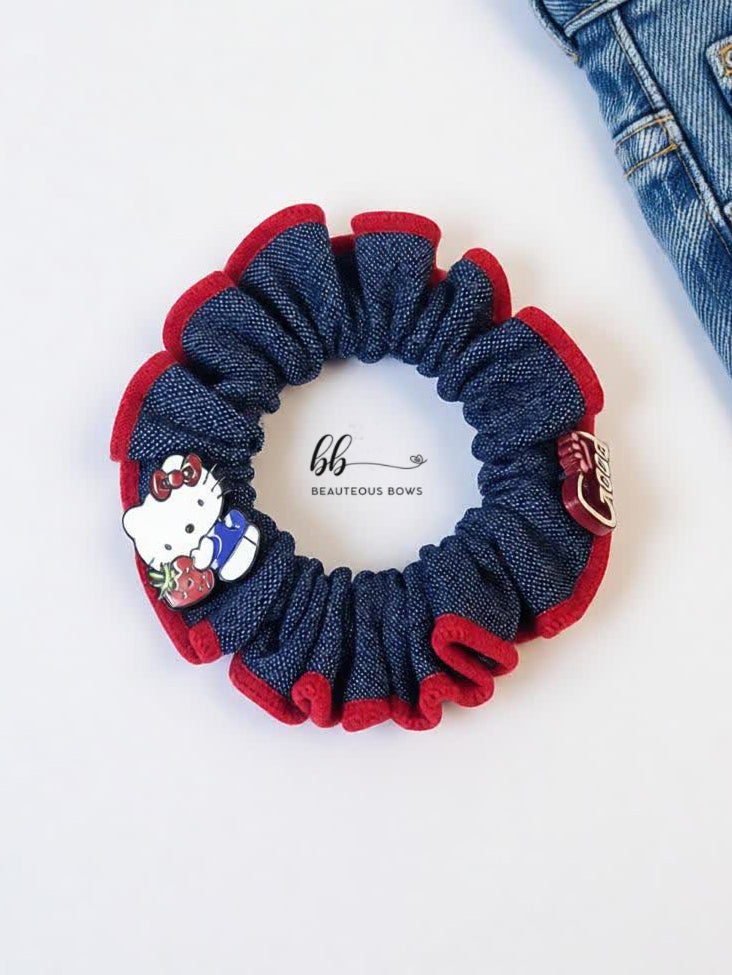 Add a playful pop to any hairstyle with these denim scrunchies, finished with cute charms and gingham bow details for a fun, girly touch.