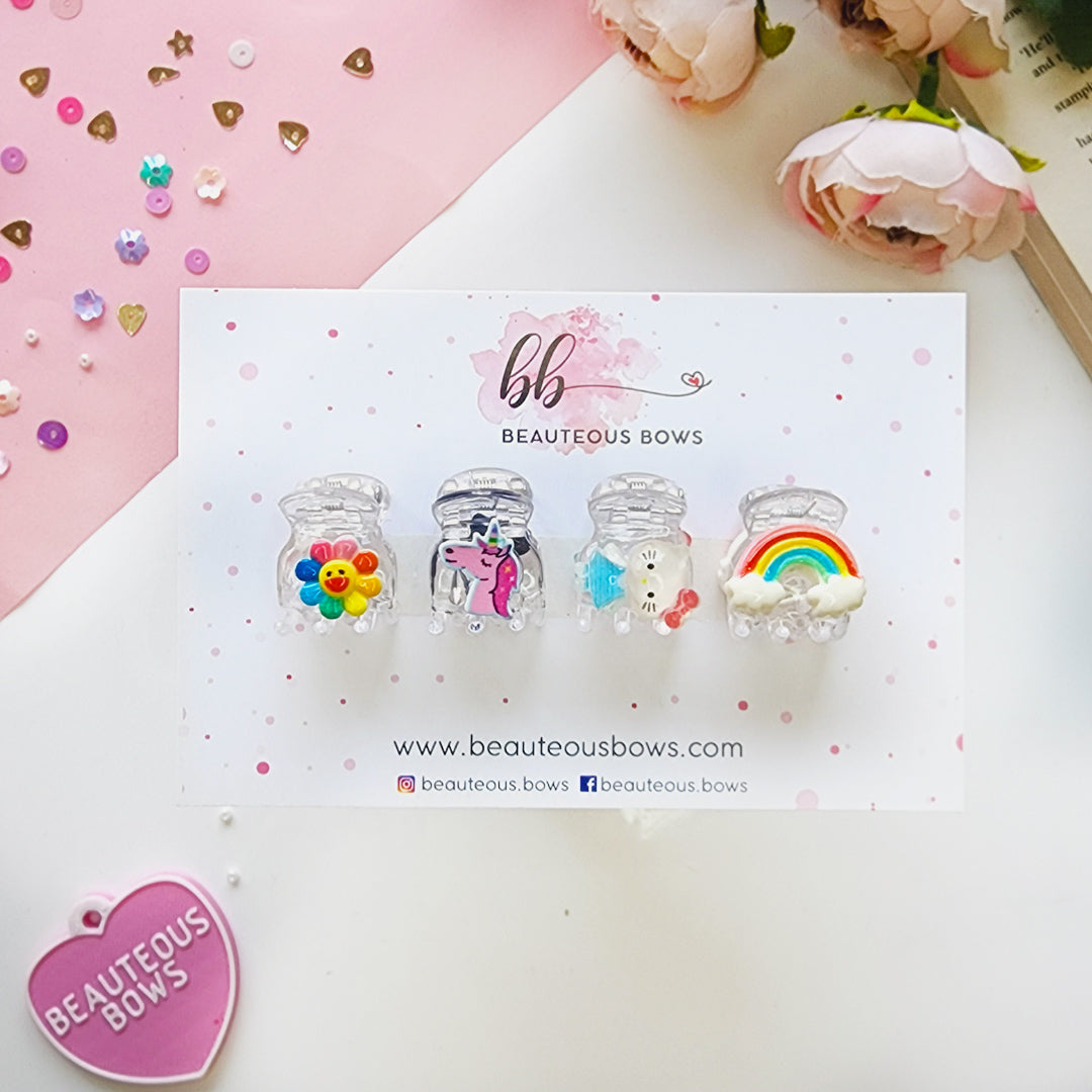 A set of Cute Little Butterfly Clips with Flower, Unicorn, Hello Kitty and Rainbow appliqués to match all your outfits. This is the perfect accessory to dress up and keep your hair in place.
